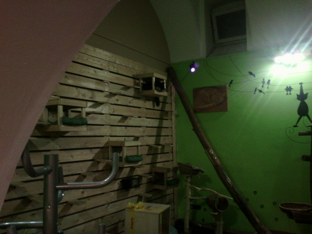 Pak je tam druhá, zelená místnost, s kočičími prolejzkami a poličkami na zdi – na jedné byla kočka, hrozně vysoko. Další stolky jsou pak v patře, ale tam bylo prázdno (úterý kolem osmé večer).