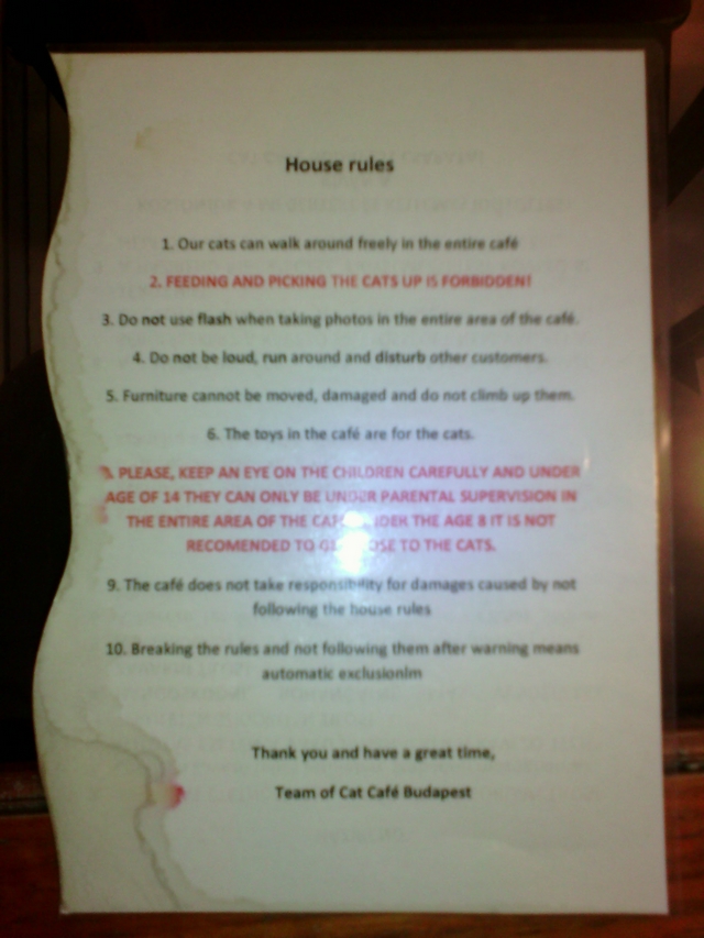 Hned u vchodu jsem zažil první dvě překvapení. Zaprvé, kavárna nemá dvojité dveře! A za druhé, hned u mě byla obsluha a dala mi do ruky pravidla, jak se v kavárně chovat. Tohle si prosím přečtěte a posaďte se, hned budu u vás.