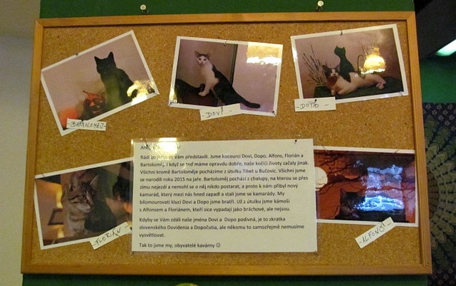 Když jsem si pohrála s Bartolomějem, šla jsem očíhnout ceduli se jmény kocourů, kde jsou i představeni. Zároveň jsem si všimla koutku, kde bylo dost stolních her. Takže si přijdou na své všichni. V druhém koutě bylo takové soukromější zázemí a trochu jsem záviděla, že bylo obsazené.