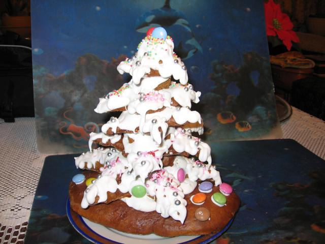 Jako by nestačilo, že je bílo venku, panička se dala do výroby vánočních stromečků z perníku (chaloupku zkusila vloni a moc se jí nepovedla, tak se dala do výroby stromečků, které jí připadají snažší!)