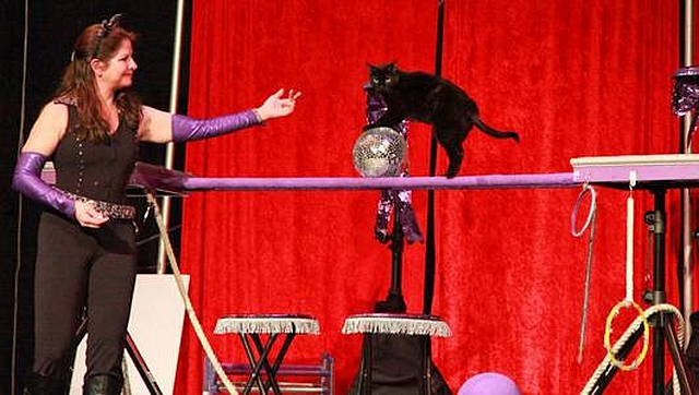 “Čísla jsou založena na tom, co kočky přirozeně dělají,” říká cirkusová ředitelka Acro-Cats, které jsou nyní ve Státech na turné. Vystupují toulavé a útulkové kočky. Více - včetně videa - v článku Cat tricks that will wow any dog lover, USA Today 4. 5. 2015.