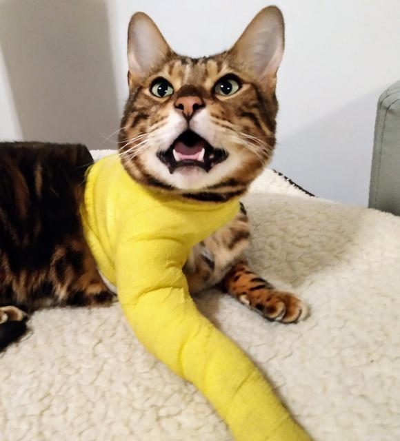 Děkujeme všem, jste velice milí, už jsme psali jinde neboť jste byli zvědaví na naší další léčbu a po včerejší návštěvě u veterináře, který Tygrika operoval máme dobrou správu. Celý roztříštěný ramenní kloub byl nahrazen titánovou destičkou spojenou 4 šrouby a titanovým nitem, který po nárůstu svaloviny se automaticky vytlačí přes kůži malou rankou ven. Packa je citlivá, hurá, nemusí se amputovat a čemž mě předtím nechtěli upozornit.